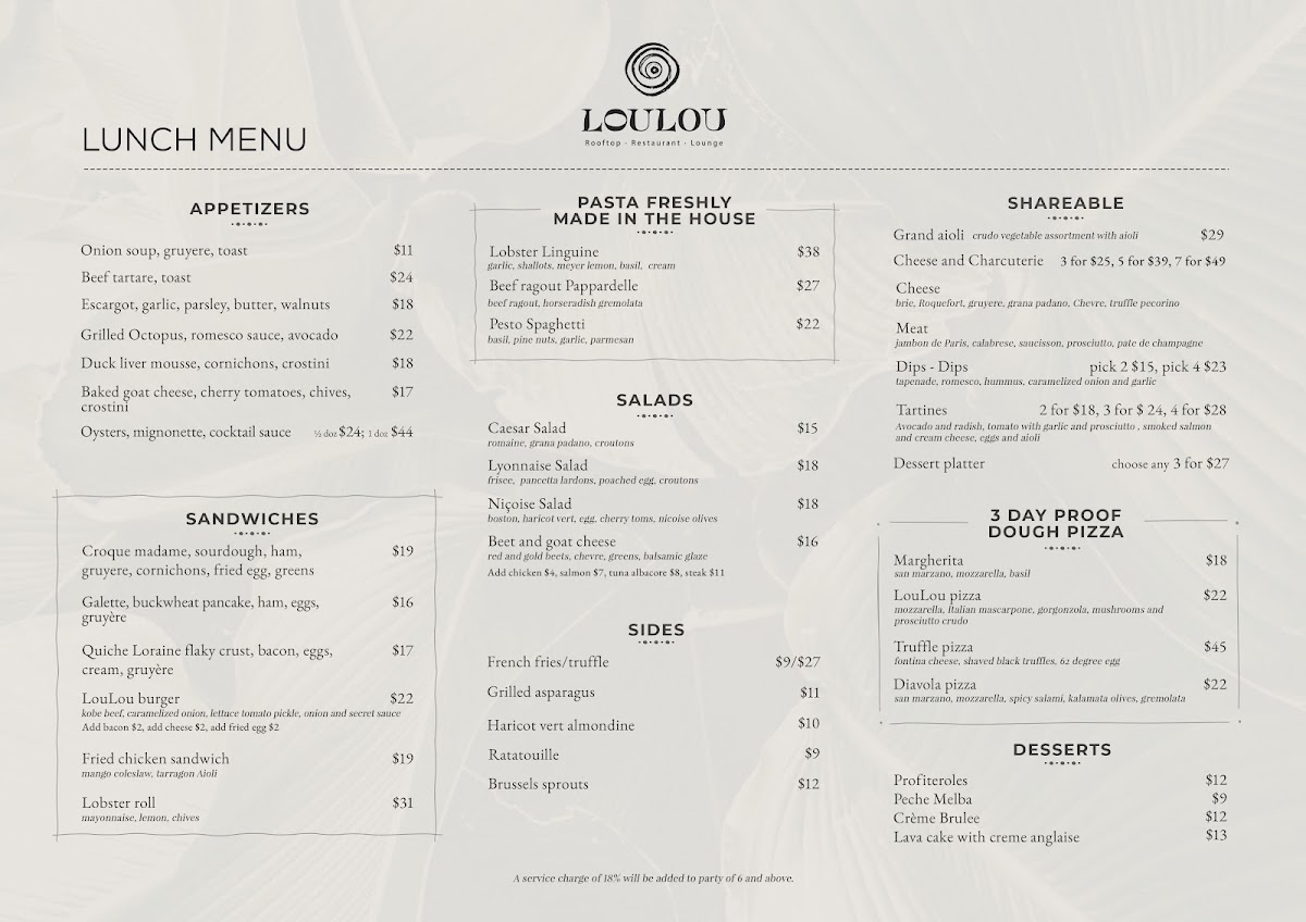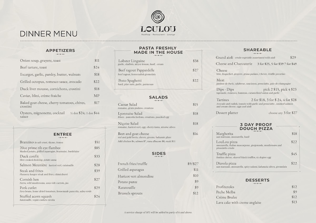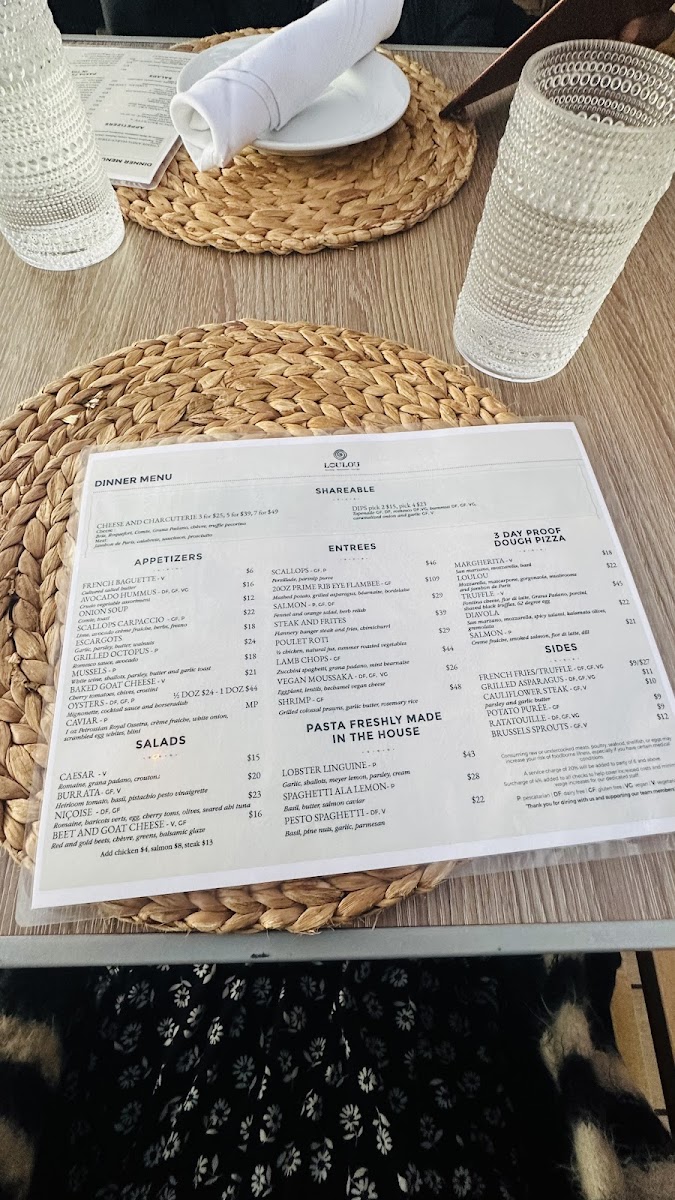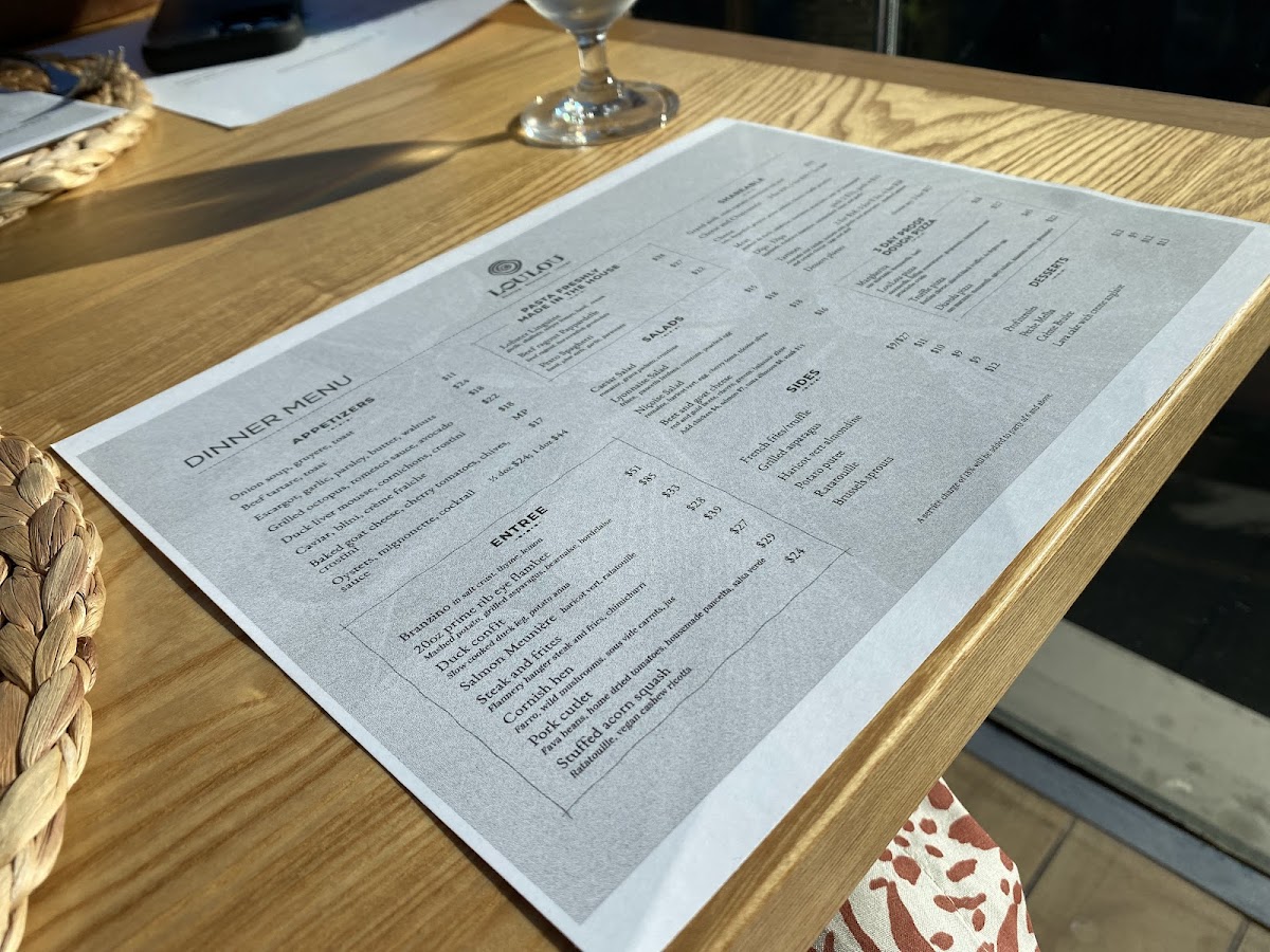 The menu at LouLou Santa Monica features a diverse selection of French and Mediterranean-inspired dishes suitable for lunch and dinner. It is organized into several key categories, including appetizers, salads, sides, main courses, and desserts, offering a variety of options that cater to different dining preferences.